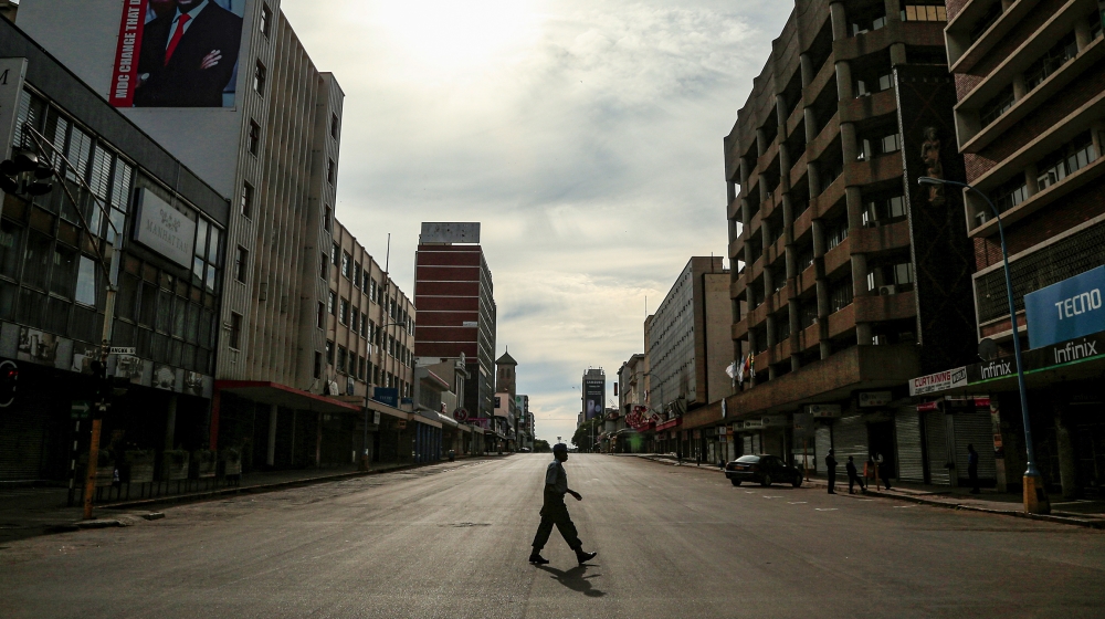 A policeman crosses an empty street in Zimbabwe's capital, Harare [Philimon Bulawayo/Reuters]