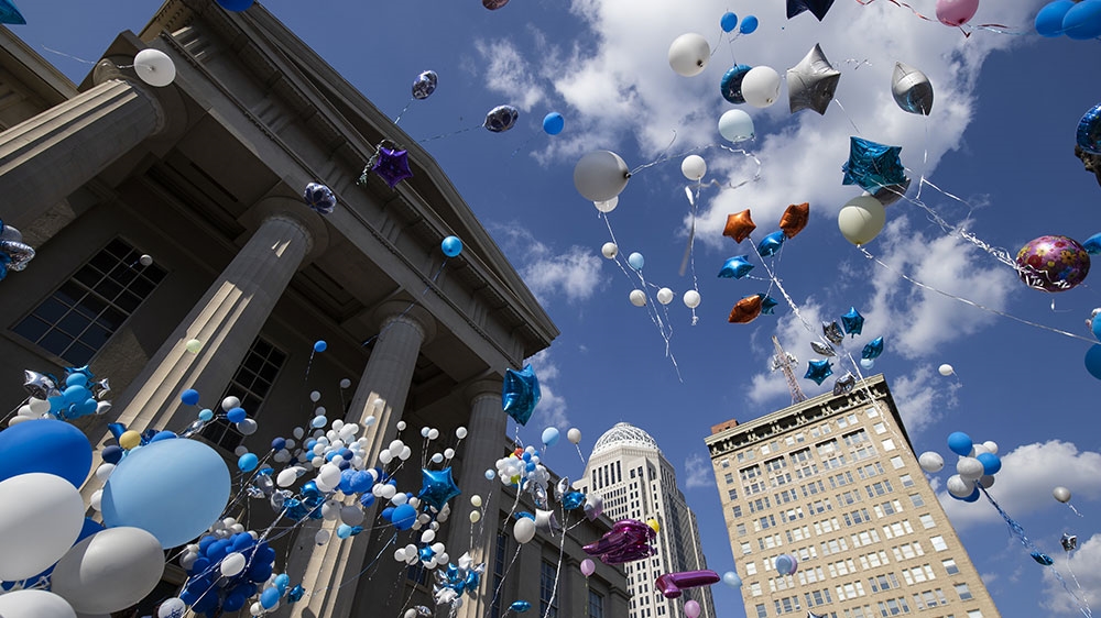 Louisville, Kentucky – Butterflies followed by hundreds of blue, silver and white balloons, many reading “Happy Birthday”, speckled the sky over Louisville, Kentucky’s Metro Hall on Saturday, part in celebration of the life of Breonna Taylor, and part in protest against the police killing of the young Black woman earlier this year.