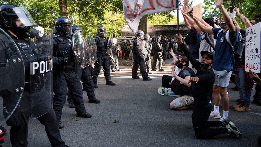 Law enforcement and security officers on June 1 clubbed and punched protesters and unleashed mounted officers and chemical agents against them [File: AP Photo/Alex Brandon]