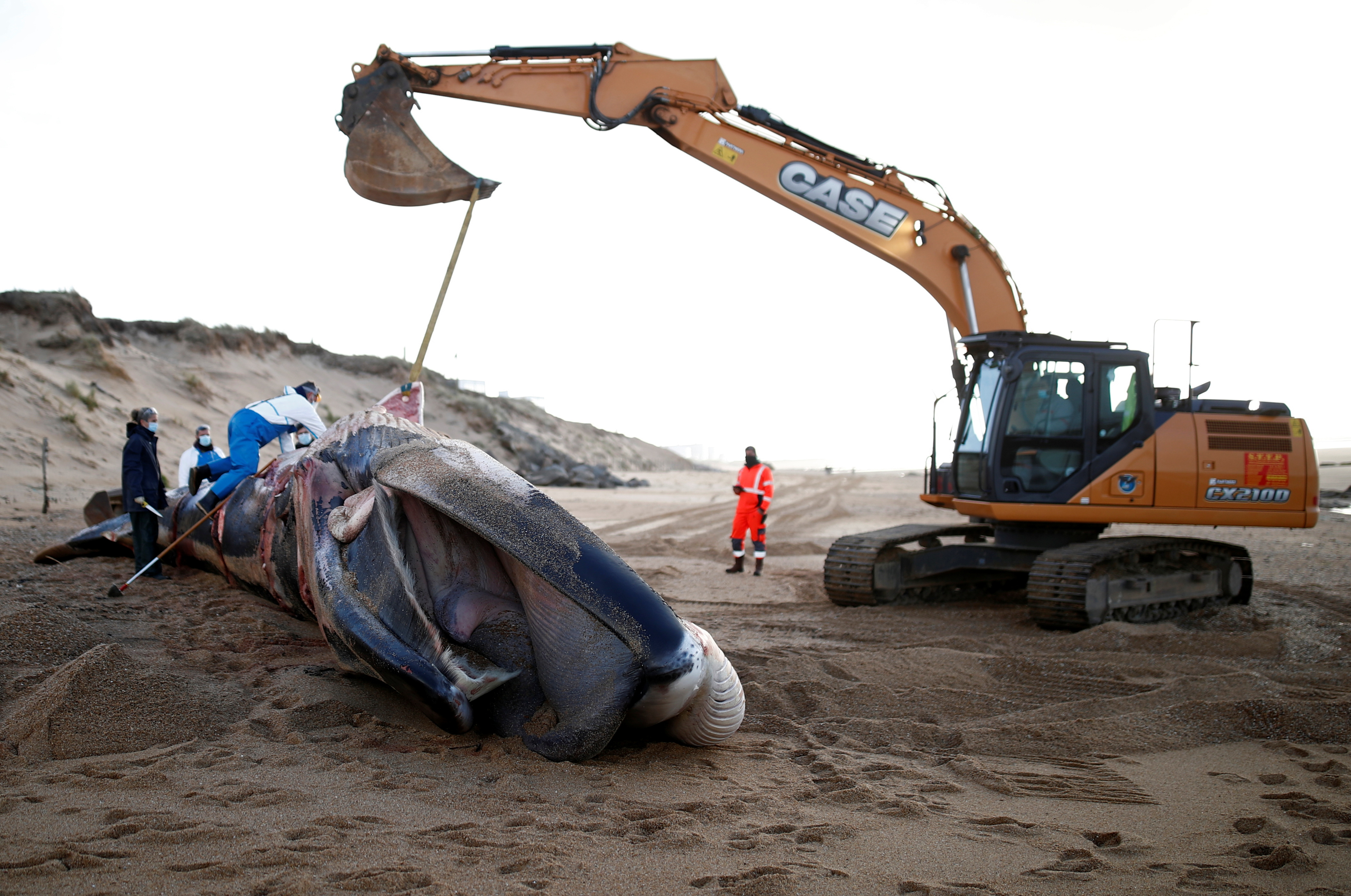 Marine biologists on Monday used a mechanical digger and long knives to dissect one of the cetaceans taking samples to find evidence of the cause of the deaths.