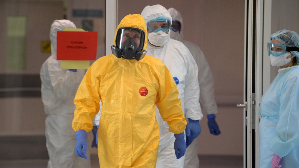Russian President Vladimir Putin wearing protective gear walks at a hospital for patients infected with the coronavirus disease (COVID-19) on the outskirts of Moscow, Russia March 24, 2020 [Alexey Druzhinin/Kremlin/Sputnik via Reuters]