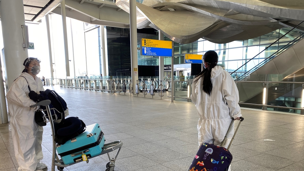 Passengers wearing protective clothing are seen at Heathrow Airport, London