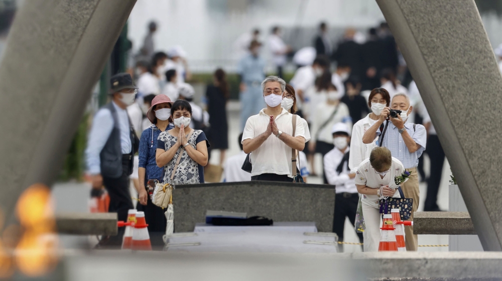 Participants, many of them dressed in black and wearing face masks, stood for a moment of silence at 8:15 am, the exact time that the atomic bomb, nicknamed “Little Boy”, exploded on August 6, 1945, obliterating Hiroshima and killing 140,000 of an estimated population of 350,000.