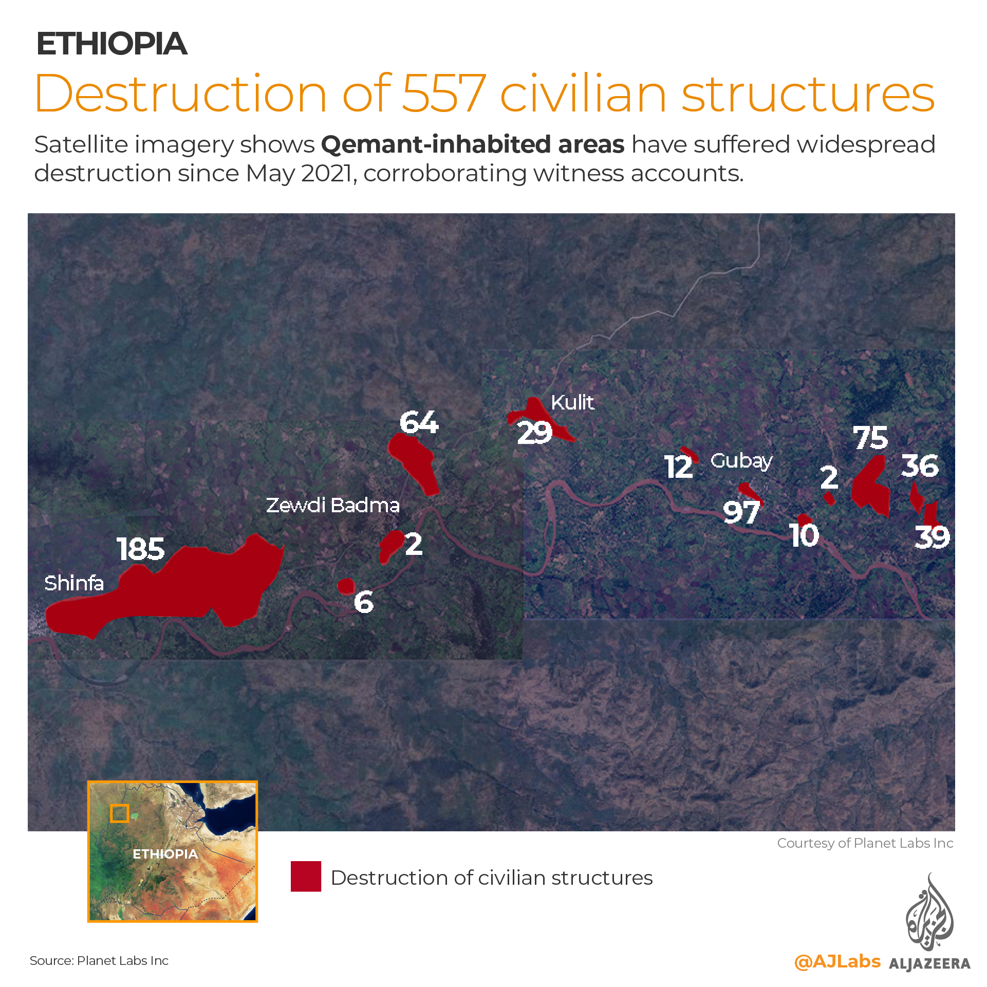 UK-based non-profit research organisation Vigil Monitor, which has been documenting atrocities across Ethiopia since the breakout of war in November of last year, worked in tandem with Al Jazeera and studied satellite imagery provided by Planet Labs, a private satellite operator, of areas identified by at least a dozen displaced people as having been heavily affected by military operations. The imagery revealed widespread destruction of some 557 civilian structures spanning from May 2021 until the present, largely corroborating witness accounts.
