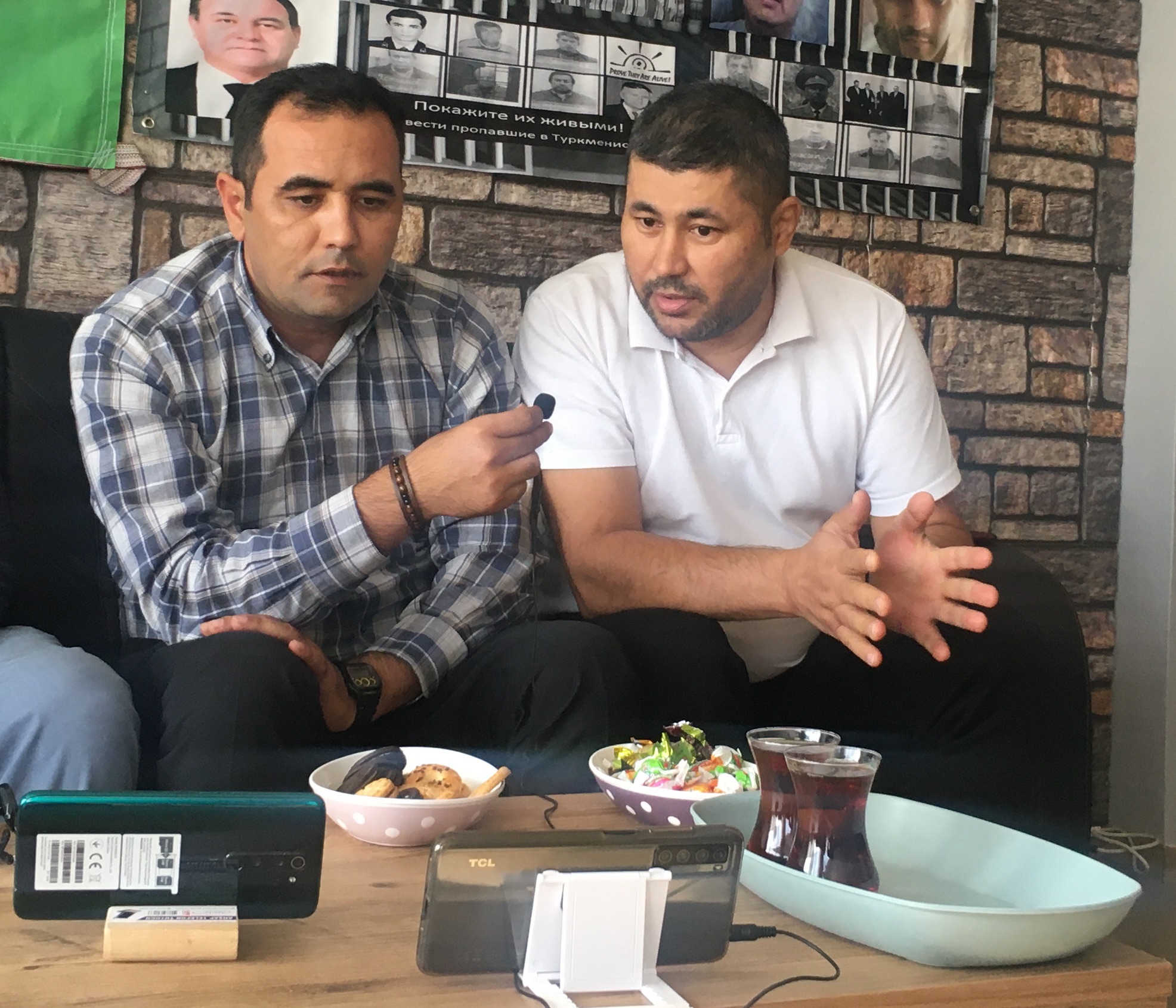Annaev arranged a smartphone on a desk and sat down on a couch next to other Turkmen. On the wall behind them, next to a portrait of Turkey’s founder Mustafa Kemal Ataturk, was a large poster bearing the photos of dozens of people who have disappeared in Turkmenistan’s prisons, in some cases not heard from for decades.