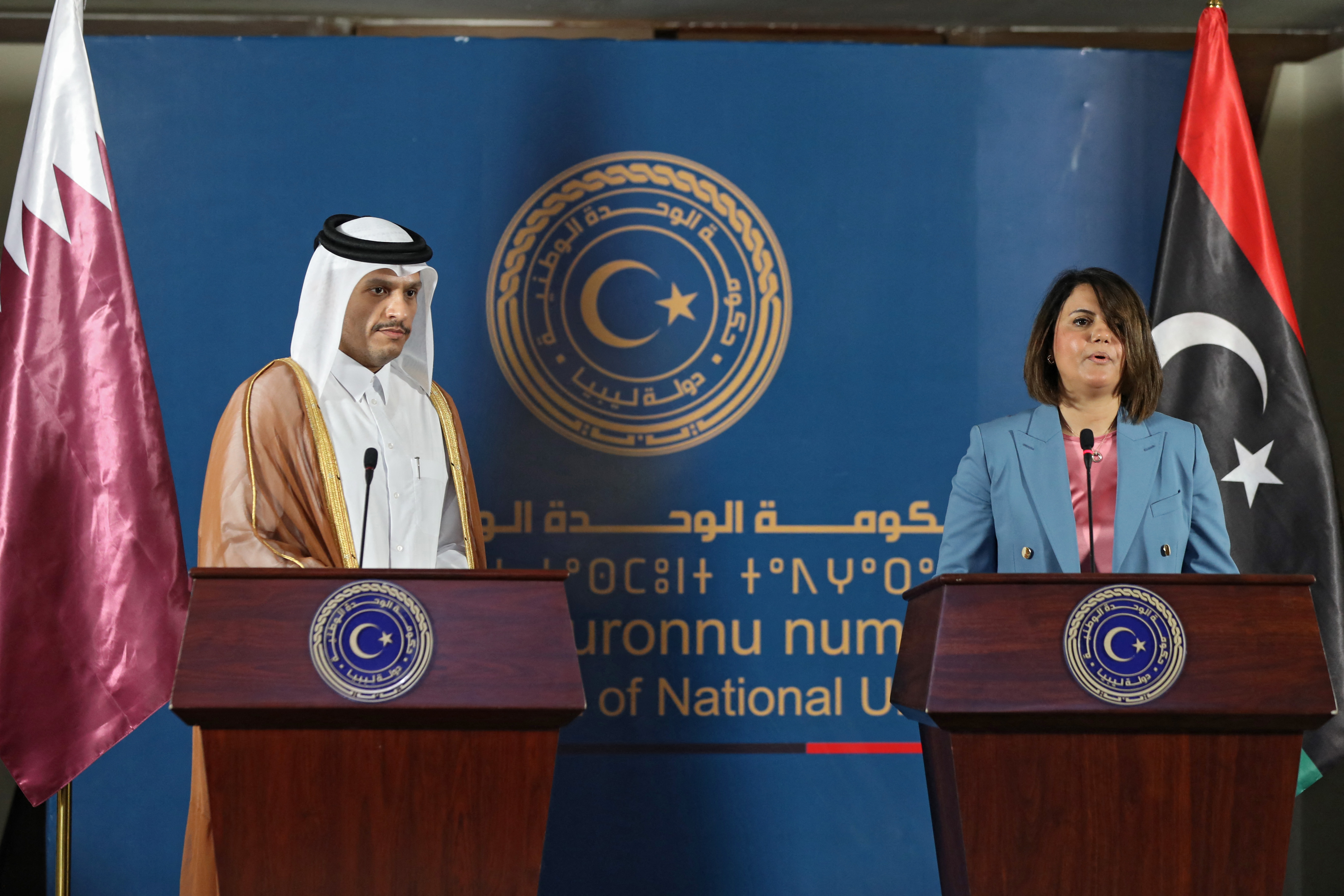 “Our exchanges were fruitful, in particular on support for the transition process in Libya … Qatar’s position is firm,” he told reporters, standing alongside his Libyan counterpart, Najla al-Mangoush.
