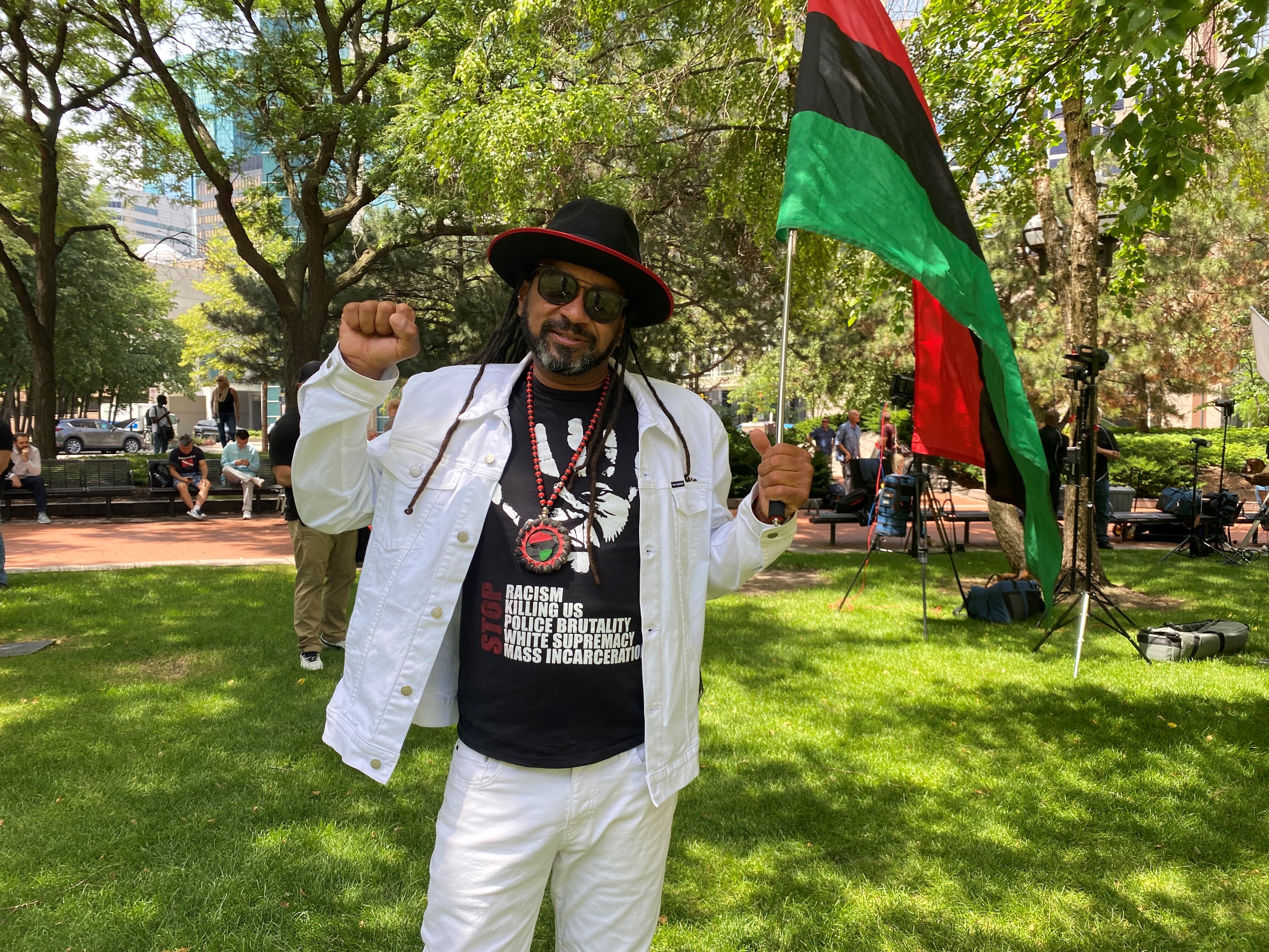 Standing under a the shade of a crop of trees is Justin Blake, the uncle of Jacob Blake who was shot by police in Kenosha, Wisconsin last August. He drove up with his brother and Jacob’s father drove up from Chicago early this morning, arriving at the plaza an hour ago. “We’re here to support the Floyd family,” he told Al Jazeera.