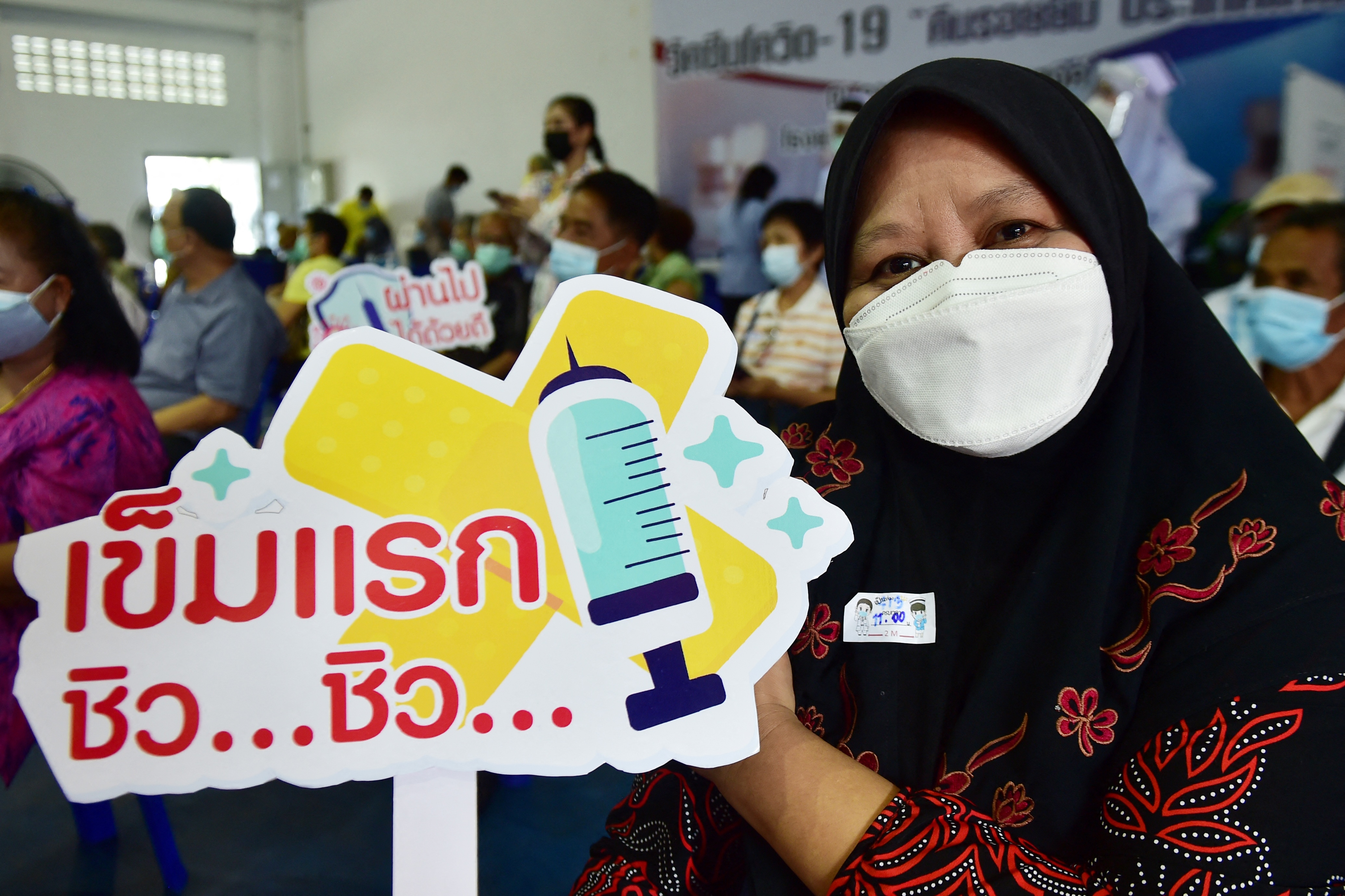 A woman poses with a sign that reads: 'First dose, easy,' after receiving a dose of the AstraZeneca COVID vaccine at the Narathiwat Hospital [Madaree Tohlala/ AFP]