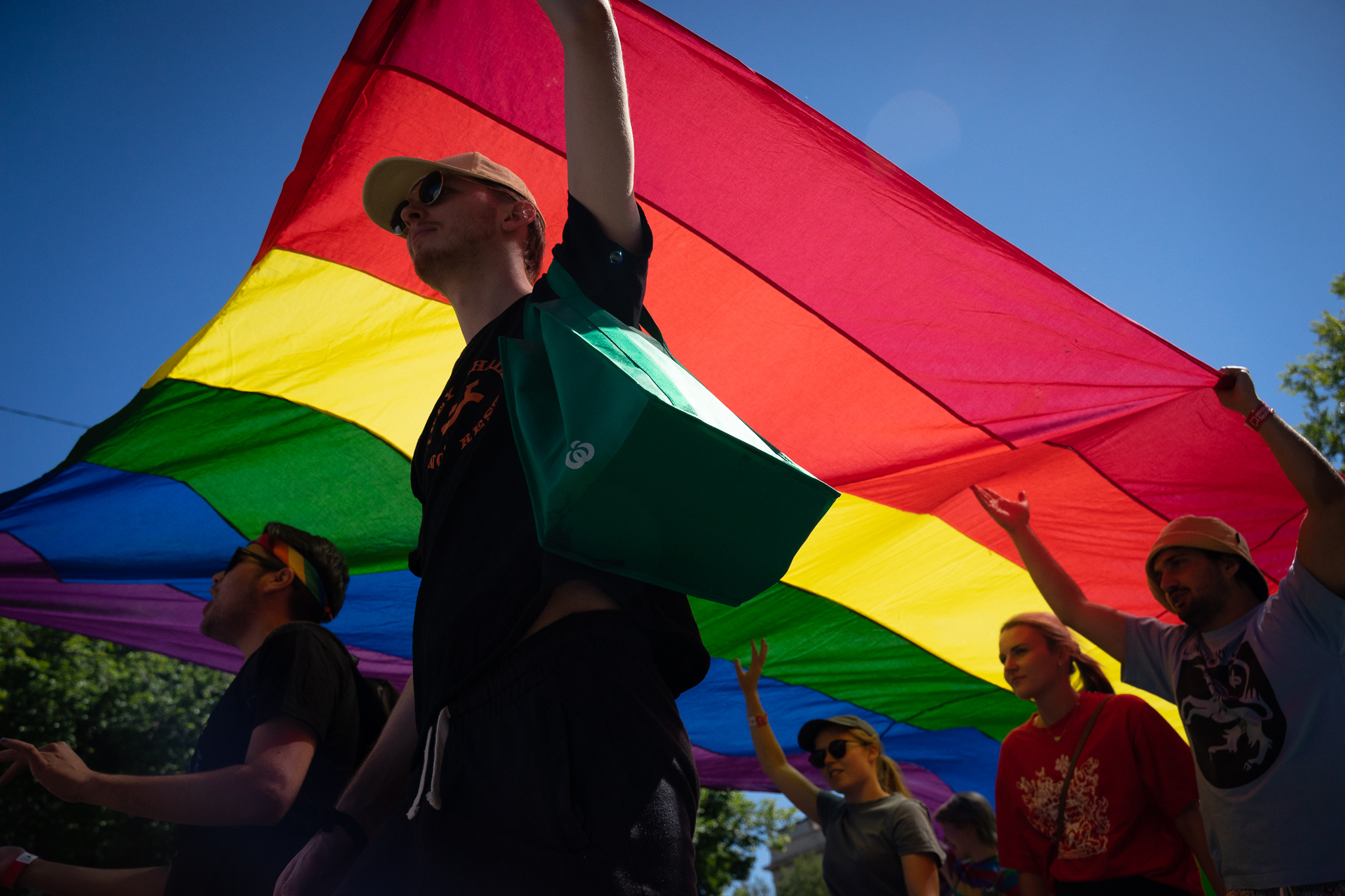 A man walks beneath the rainbow Pride flag in Melbourne