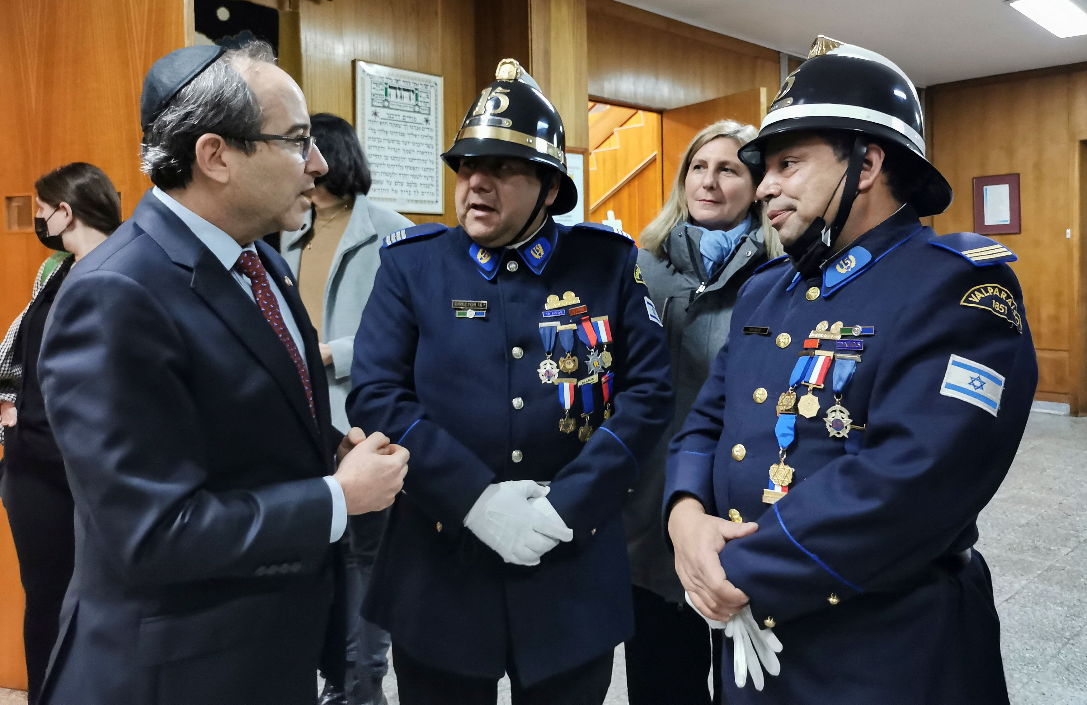 Israeli ambassador Gil Artzyeli speaks with members of the Israel Fire Company during a religious ceremony at a synagogue in Vina del Mar, Chile [Ramon Sernuda/Reuters]