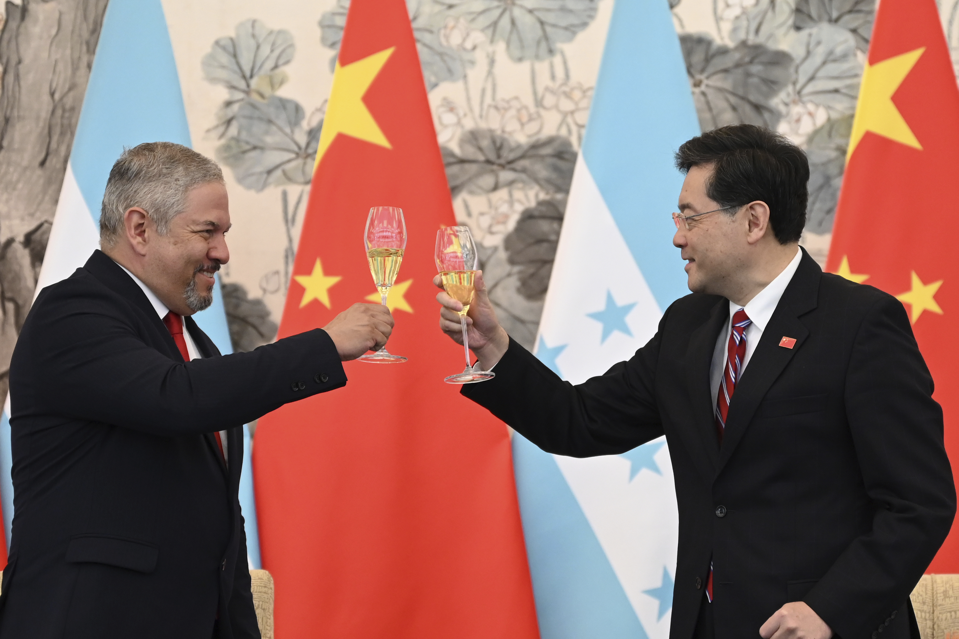 Honduras Foreign Minister Eduardo Enrique Reina Garcia, left, and Chinese Foreign Minister Qin Gang raise a toast following the establishment of diplomatic relations between the two countries [File: Reg Baker/Pool Photo via AP]