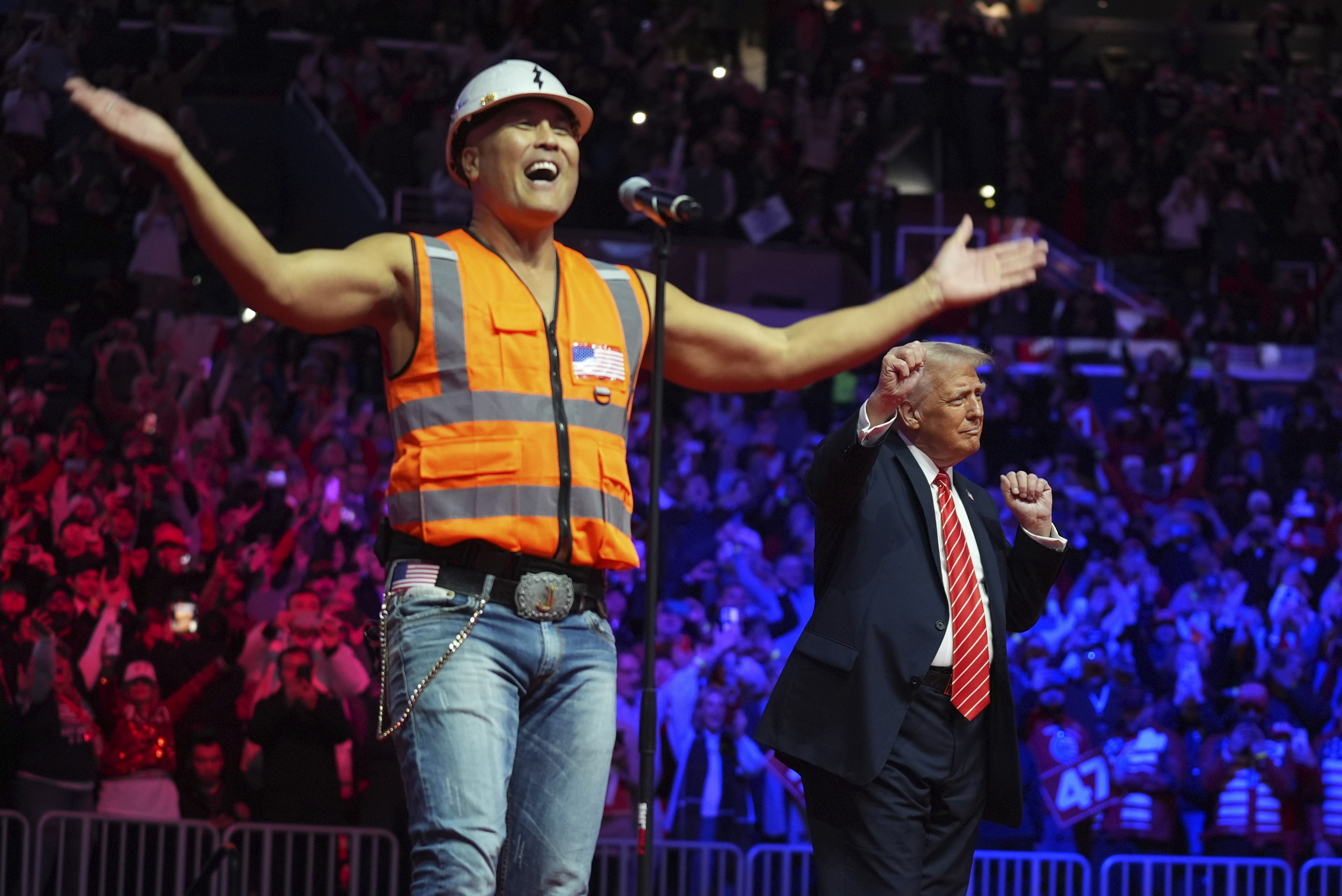 Sticking to the populist imagery and messaging of his presidential campaign, Trump entered the stadium from a public entrance, allowing him to walk through the crowds of supporters before reaching the stage.
