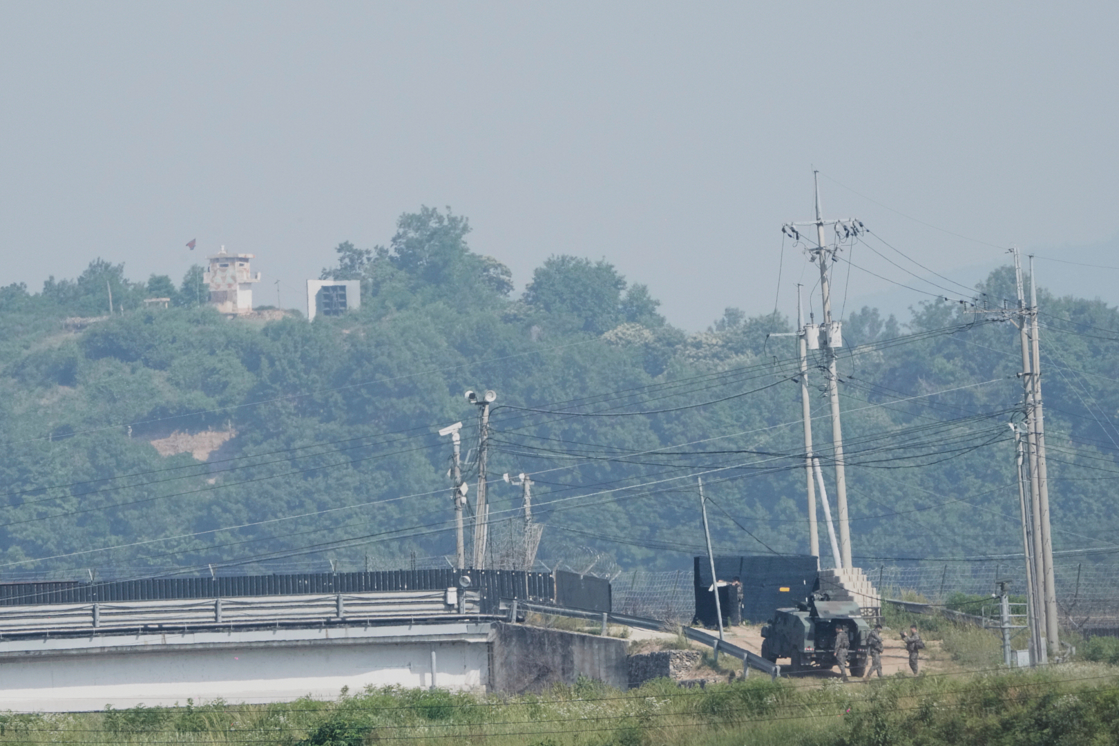 A North Korean military guard post, loudspeaker, top left, and South Korean army soldiers, bottom right, are seen from Paju, South Korea, near the border with North Korea, on June 12, 2025 [Ahn Young-joon/AP]
