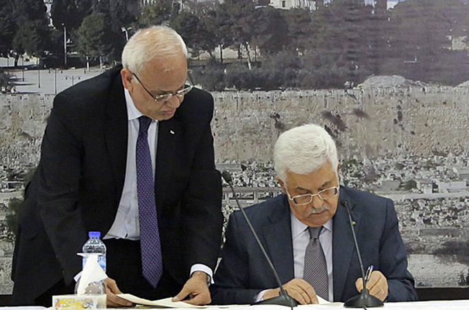 President Abbas signs papers in bid to join ICC, a day after resolution to end Israeli occupation was defeated at UNSC.