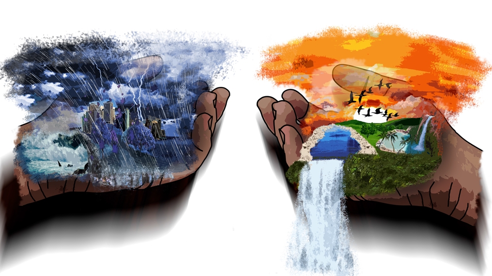 The archangel peered down. He saw sunshine and green rolling hills and rich soil on one side, and on the other he saw ice and snow and the sun covered by clouds. ‘What is this thing you have made, God?’ he asked. ‘I see beauty very much like heaven on one side, and then I see darkness and gloom and cold on the other – a bit like a really cold hell.’