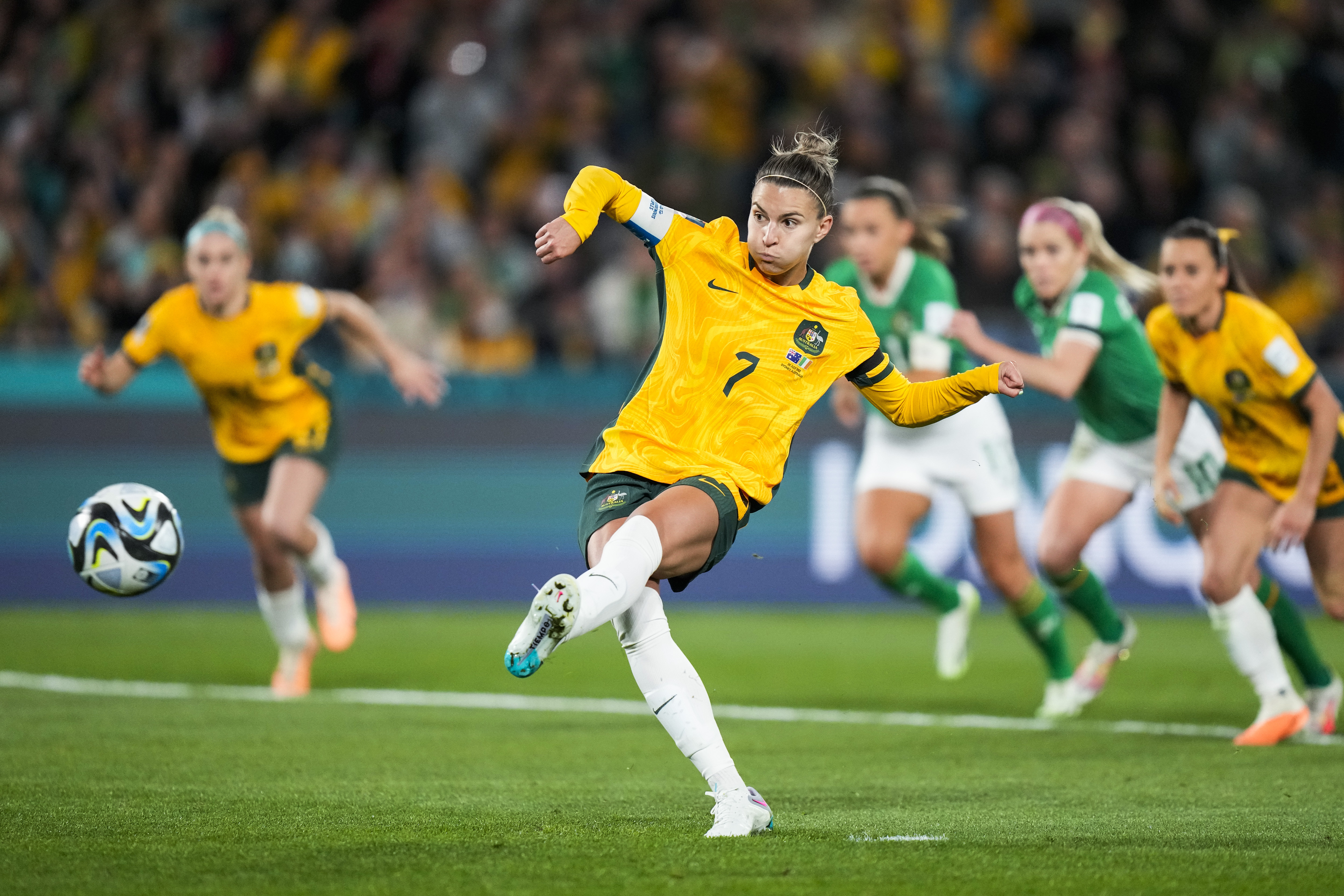 Steph Catley swept home a 52nd-minute penalty on Thursday to end Ireland’s resistance and spark an eruption of joy from fans inside Stadium Australia.