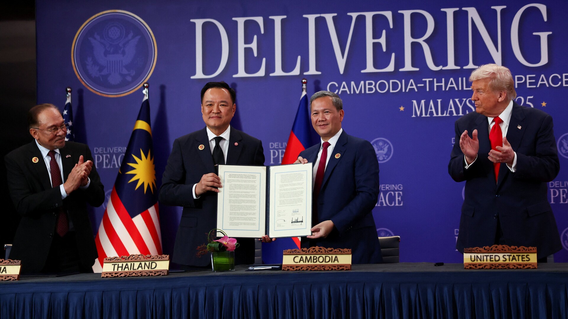 ![Thai Prime Minister Anutin Charnvirakul, left, and Cambodian Prime Minister Hun Manet shake hands during the signing of a ceasefire on the sidelines of the Association of Southeast Asian Nations summit in Kuala Lumpur, Malaysia, on October 26, 2025 [Evelyn Hockstein/Reuters]](https://aljazeeranews-mggx1uo47w.edgeone.app/wp-content/uploads/2025/10/2025-10-26T073859Z_1114568740_RC2IJHAUK2UZ_RTRMADP_3_ASEAN-SUMMIT-1761555703.jpg?resize=770%2C513&quality=80)