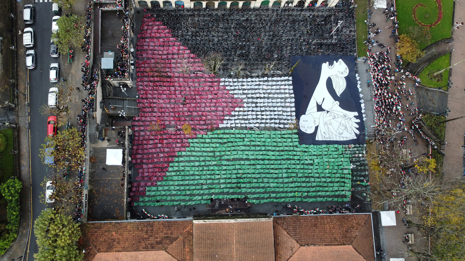 Hear the moment an air raid siren blares in Guernica, Spain as protesters form the Palestinian flag in the same market square that was bombed by Nazi and fascist forces during the Spanish civil war.