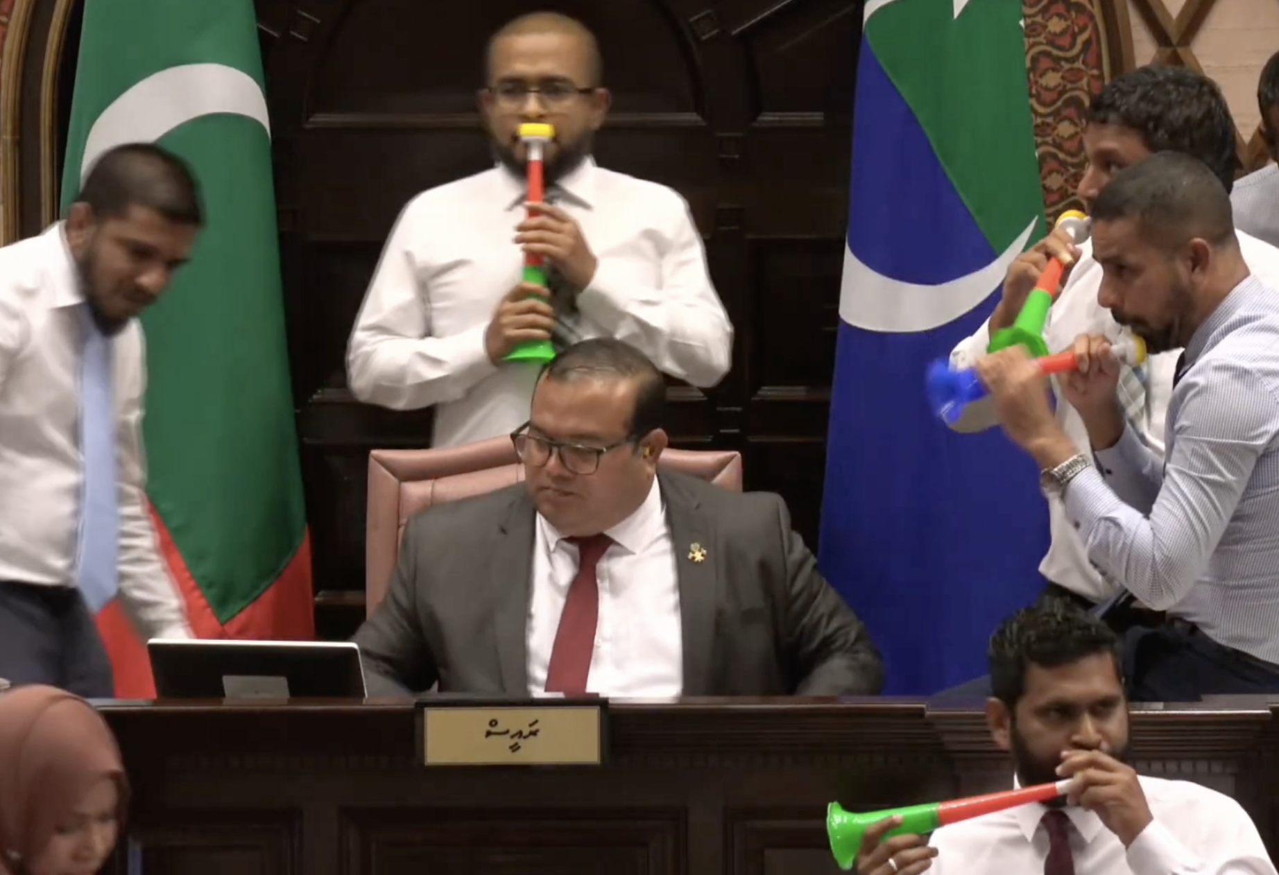 MPs went after each other, throwing punches, pulling hair and blowing toy trumpets during a session of parliament in the Maldives. The fight came after the opposition party refused to approve 4 new cabinet ministers – who are members of the newly-elected president’s party.